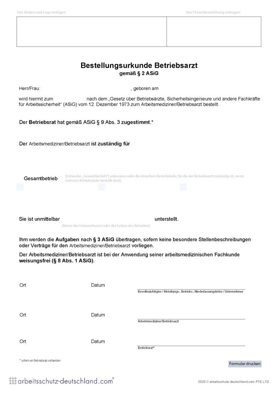 Mit diesem Formular kann ein/e Betriebsarzt/-in gem. AsiG und DGUV Vorschrift 2 bestellt werden. Das Formular kann für einen oder mehrere Stondorte/Firmensitze verwendet werden.