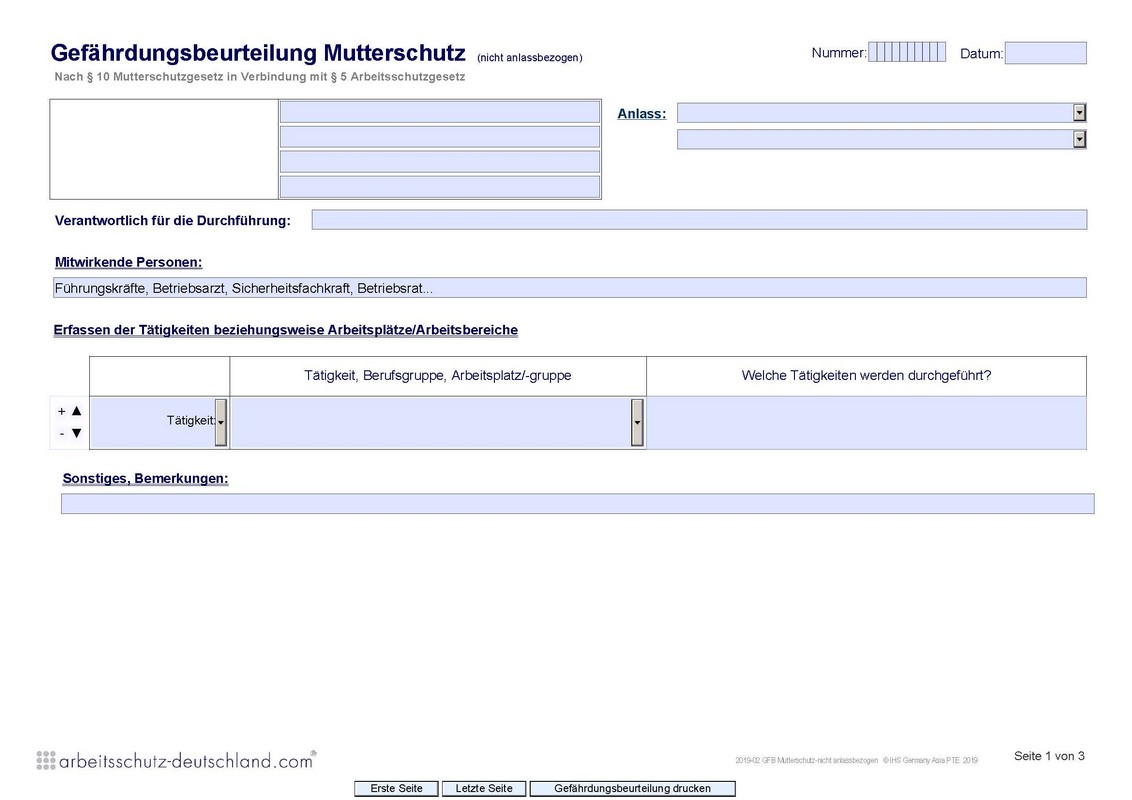Mit diesem dynamischen PDF-Tool können Sie die gesetzlich geforderten "nicht anlassbezogenen" Gefährdungsbeurteilungen für alle Tätigkeiten bzw. Betriebsbereiche gemäß § 10 Mutterschutzgesetz erstellen und dokumentieren.
