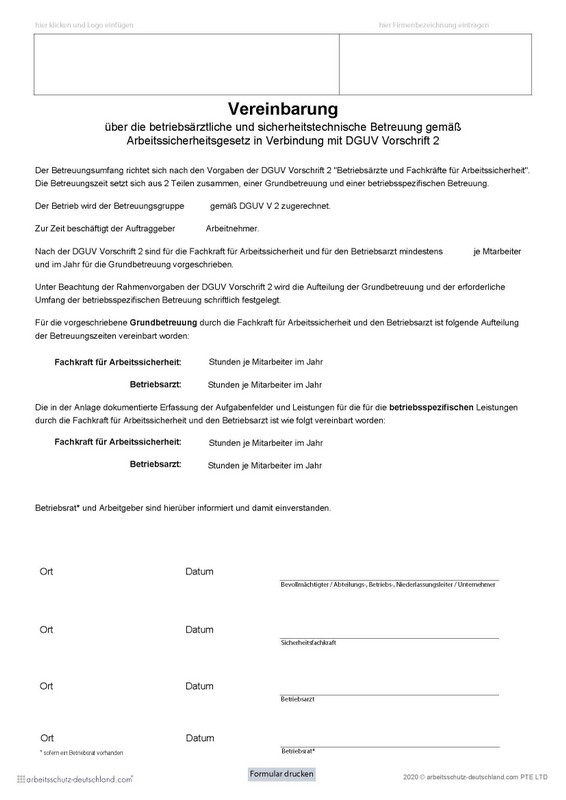 Mit diesem Formular können die Einsatzzeitenaufteilungen über die betriebsärztliche und sicherheitstechnische Betreuung gemäß Arbeitssicherheitsgesetz in Verbindung mit DGUV Vorschrift 2 dokumentiert werden.