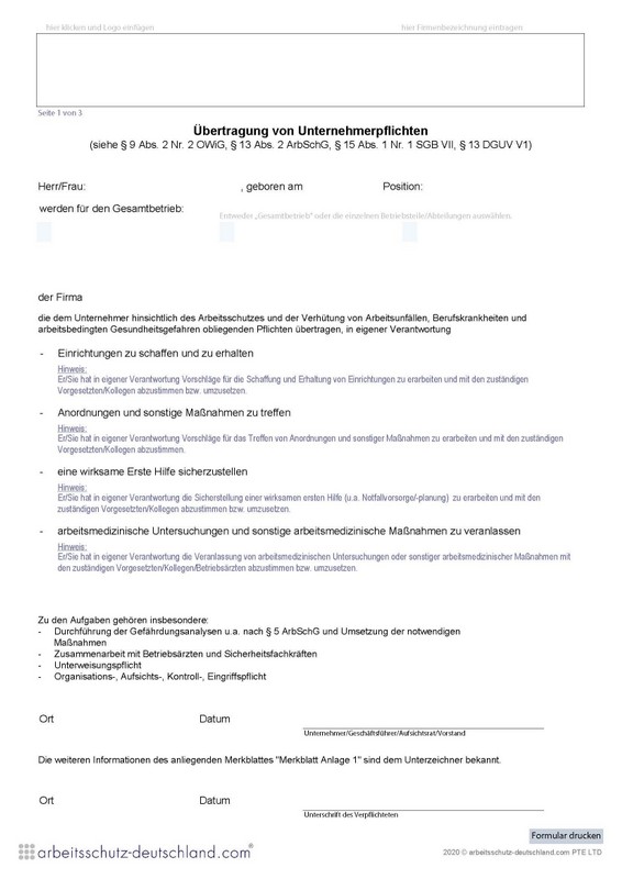 Mit diesem Formular können Unternehmerpflichten auf Führungskräfte gemäß Arbeitsschutzgesetz übertragen werden.