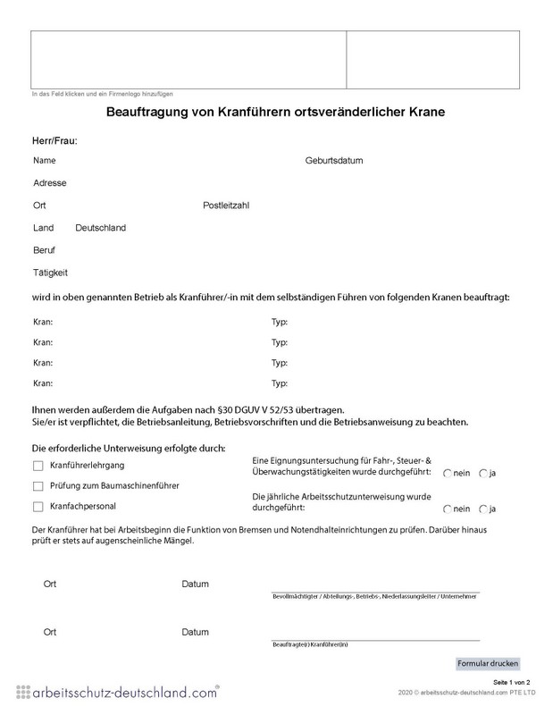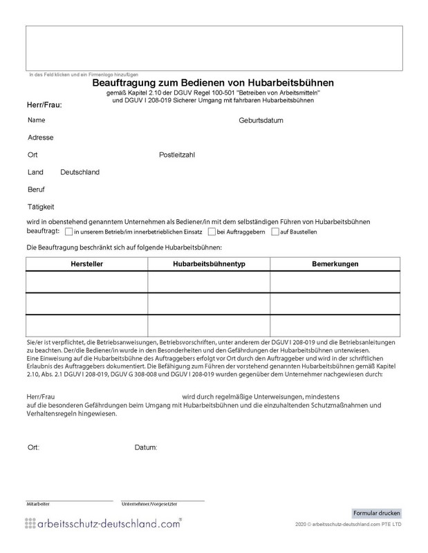 Mit diesem Formular können Beschäftigte mit dem Bedienen von Hubarbeitsbühnen beauftragt werden.