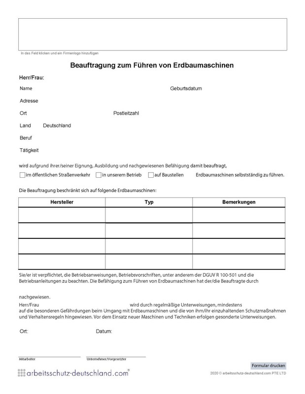 Mit diesem Formular können Beschäftigte mit dem Bedienen von Erdbaumaschinen beauftragt werden.
