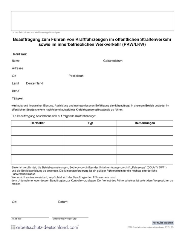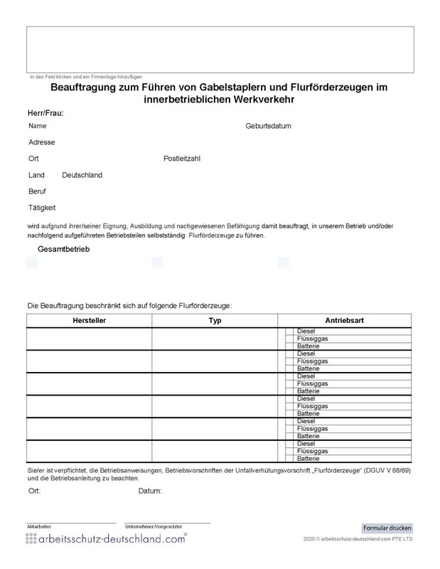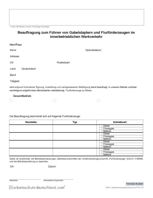 Mit diesem Formular können Beschäftigte mit dem Bedienen von bis zu 4 verschiedenen Gabelstaplern und Flurförderzeugen im innerbetrieblichen Werkverkehr beauftragt werden.