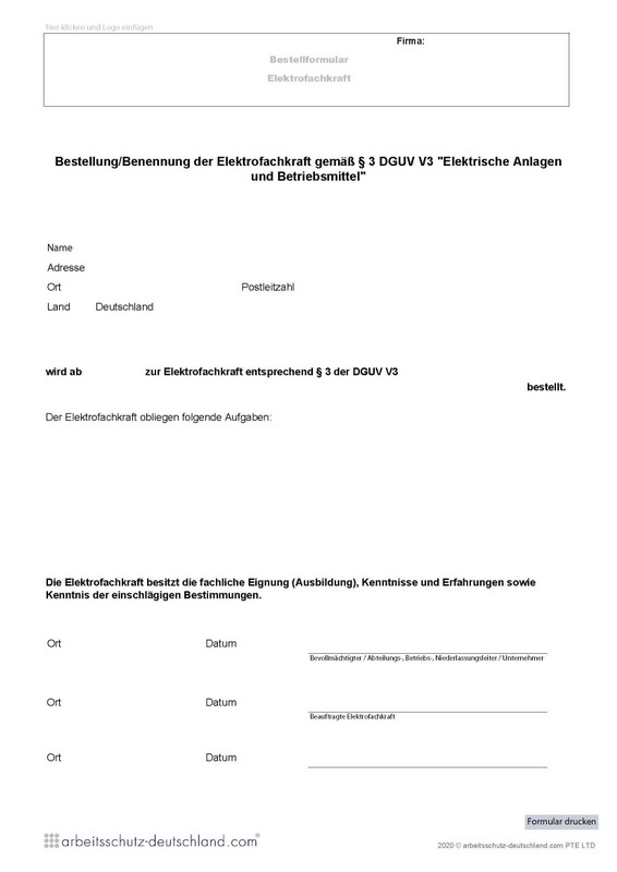Mit diesem Formular können Elektrofachkräfte gem. § 3 DGUV V3 bestellt werden. Das Formular kann für einen Stondort/Firmensitz verwendet werden.