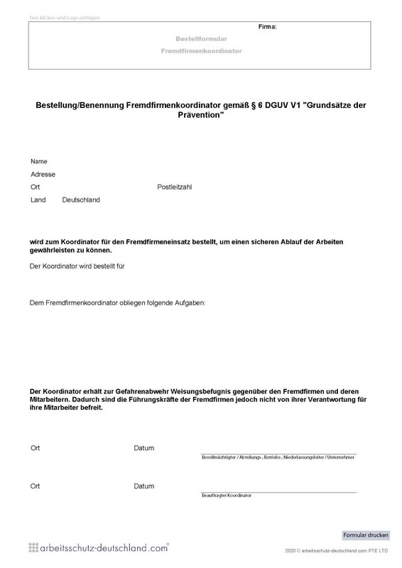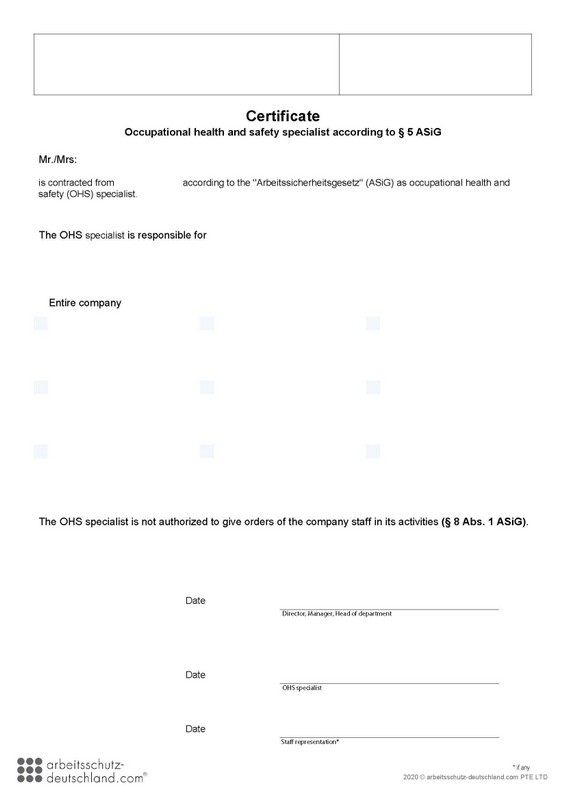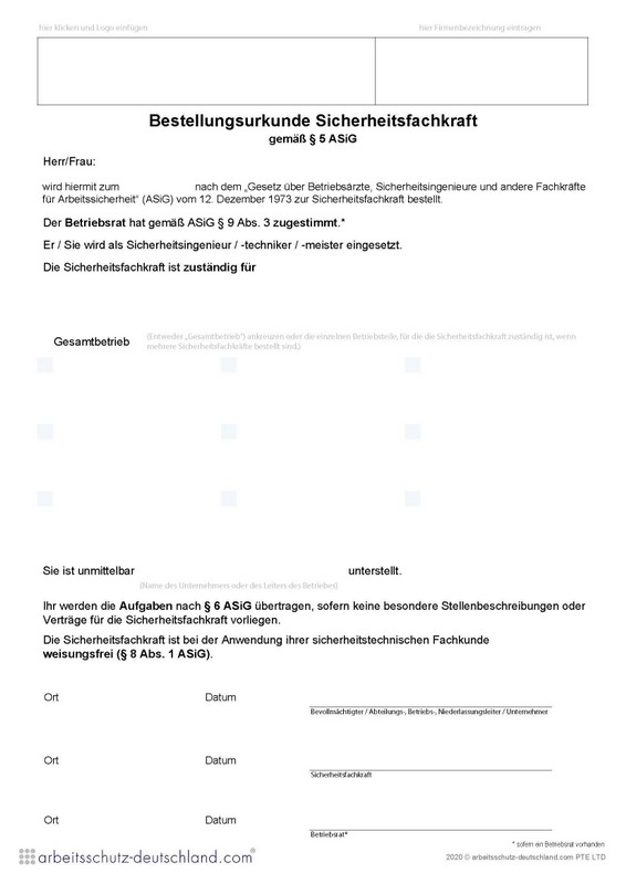 Mit diesem Formular können Sicherheitsfachkräfte gem. AsiG, DGUV Vorschrift 2 bestellt werden. Das Formular kann für mehrere Stondorte/Firmensitze verwendet werden. (englische Version).