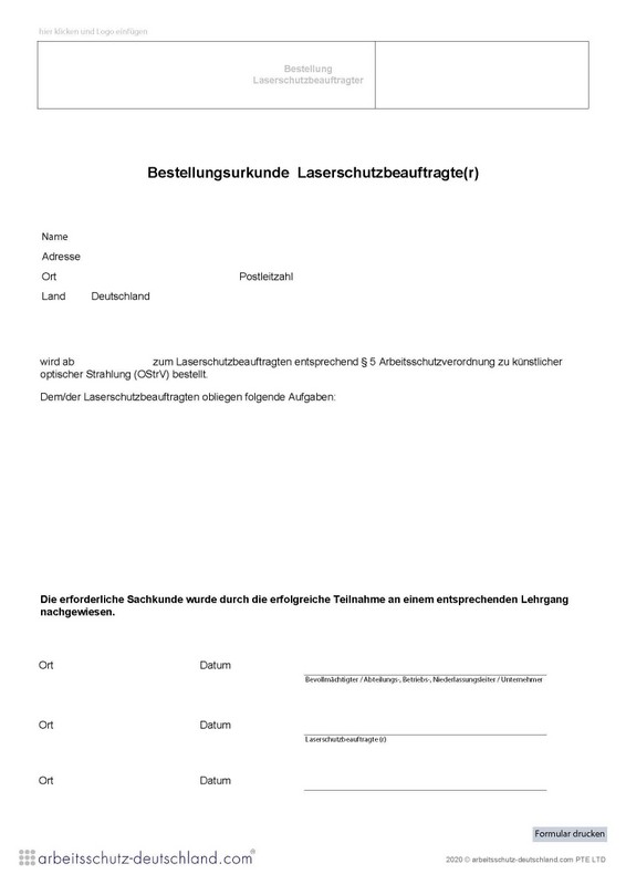 Mit diesem Formular können Laserschutzbeauftragte gemäß OStrV bestellt werden. Das Formular kann für einen Stondort/Firmensitz verwendet werden.