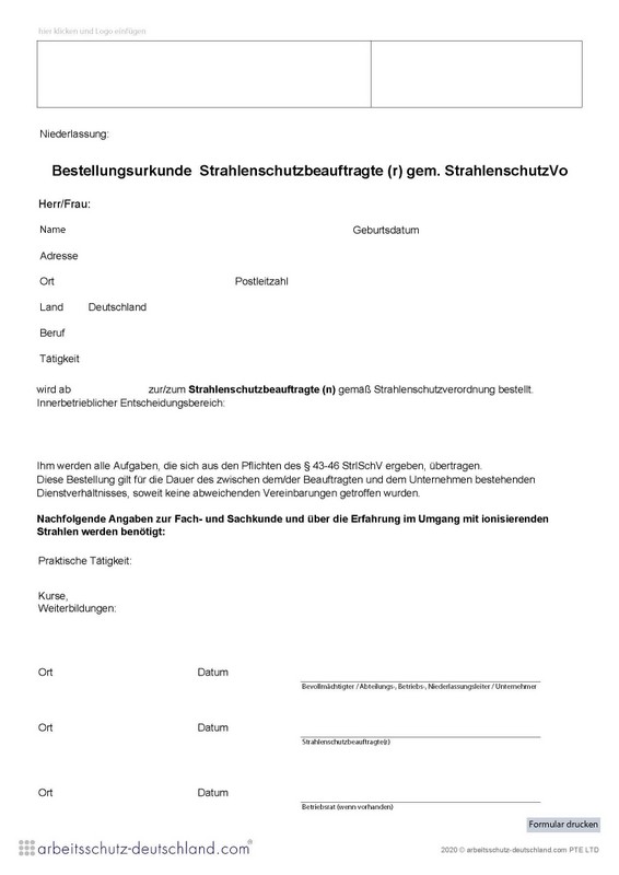 Mit diesem Formular können Strahlenschutzbeauftragte gemäß StrahlenschutzVo bestellt werden. Das Formular kann für einen Stondort/Firmensitz verwendet werden.