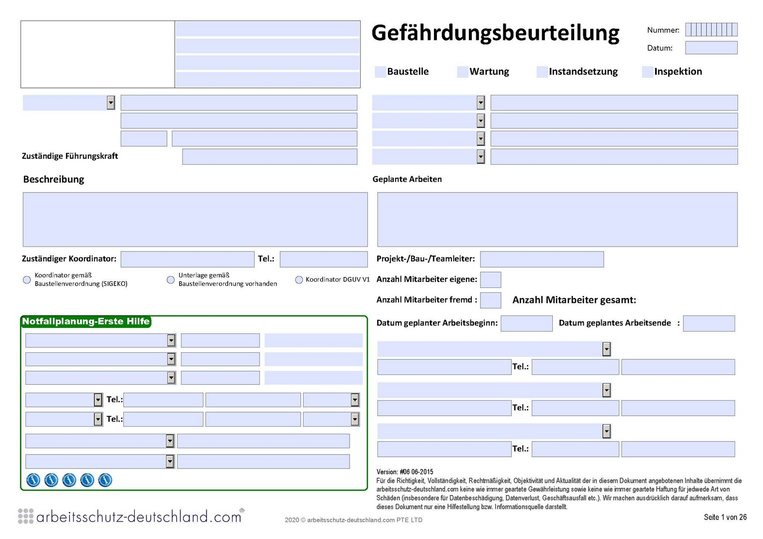 Mit diesem dynamischen PDF-Tool können Sie umfangreiche Gefährdungsbeurteilungen für alle Arten von Baustellen (Hochbau, Tiefbau, Ingenieurbau, Gala-Bau u.ä.) oder für alle Arten von Wartungs- und Instandhaltungstätigkeiten durchführen.