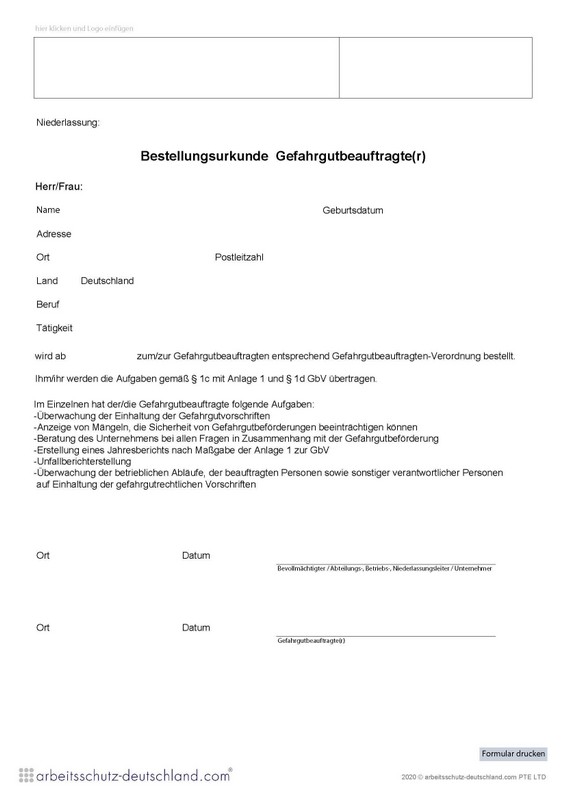 Mit diesem Formular können Gefahrgutbeauftragte bestellt werden. Das Formular kann für einen Stondort/Firmensitz verwendet werden.