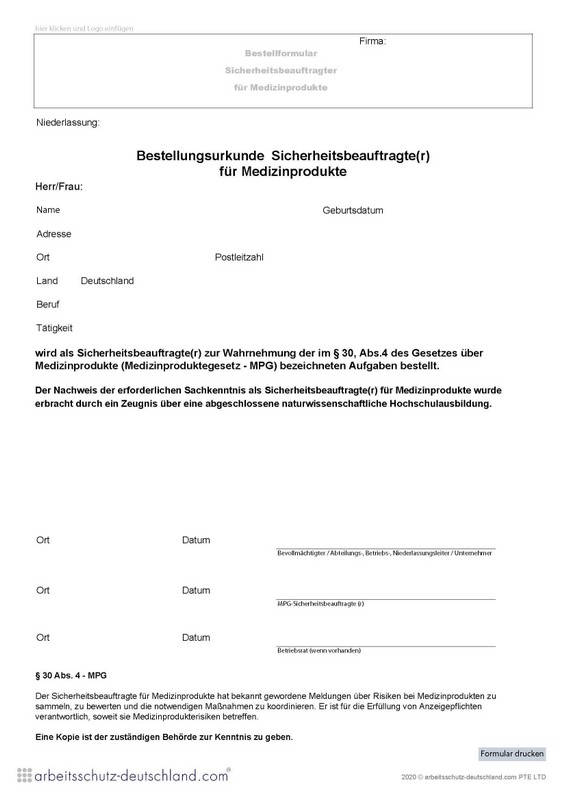 Mit diesem Formular können Sicherheitsbeauftragte für Medizinprodukte gemäß Medizinproduktegesetz - MPG bestellt werden. Das Formular kann für einen Stondort/Firmensitz verwendet werden.